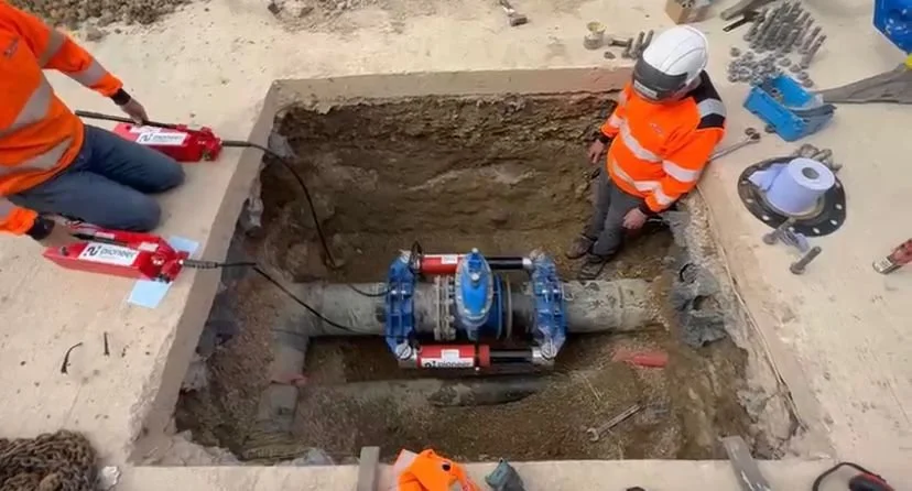 The gasket had failed on a 315mm sprinkler main so we excavated to remove the chamber that was too small to access, uncovered all the other services & loaded the flange spreader to the main. The sprinkler system was isolated at the pumps and de-pressurised